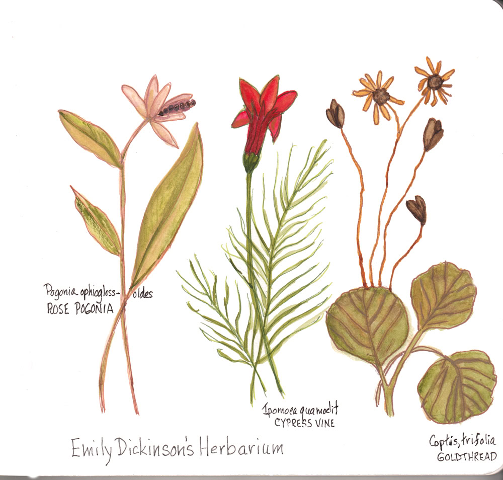 Pressed flowers in an Herbarium created by Emily Dickinson captured me with their unusual lines and shapes - as if they were dancing. Watercolor and ink.