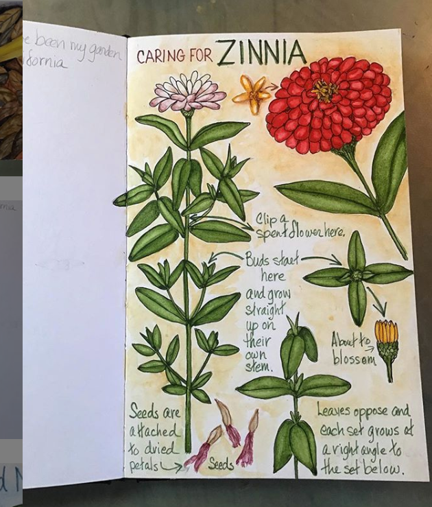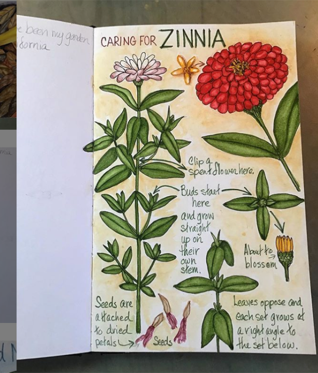 A Plant Page. Scattered through my garden journals, these plant pages are in-depth studies of all the parts of my favorite garden flowers. Every Spring I get huge red Zinnia from a nursery in California and bring them back to Santa Fe where they are happy enough to flower all Summer as long I am keep up with deadheading.