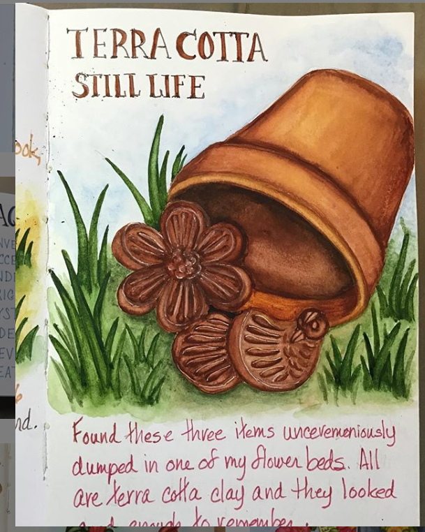 It’s a blessing to have an “artist’s eye”. You notice things that have unexpected beauty. These terra cotta pieces were really just in the way while I was cleaning up a flower bed for Spring planting. But something about the relationship struck my fancy so I sketched a still life. I cleaned things up in the sketch - as if they spiffed up for a portrait.