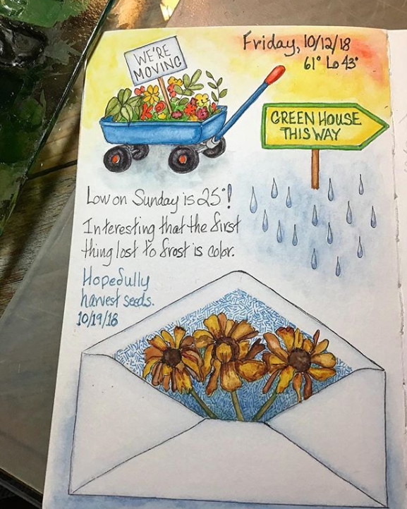 Even though I now have a greenhouse and can keep some plants with me over the Winter, the day of the first freeze is still a little sad for me, so I tried to cheer up with some bright color and humor on this page.