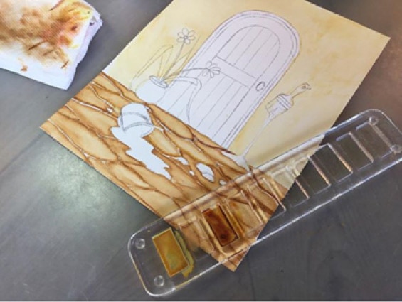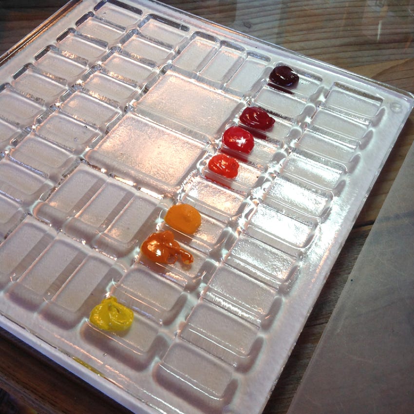 Watercolors do not bead up on the glass because of a fine texture on the surface that is fired in - fine enough to allow perfect visibility when you set the mix in place on your work to see how it will look - see the photo below.
