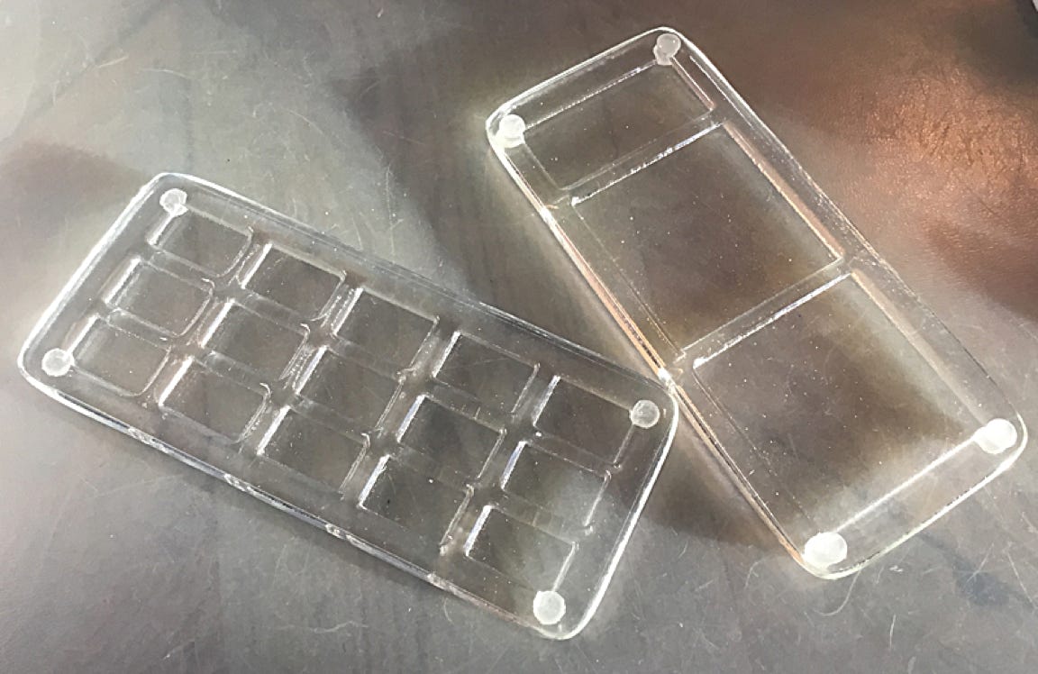 They can be filled with tube color to serve as a pan palette, or they can be used for temporary color mixing.